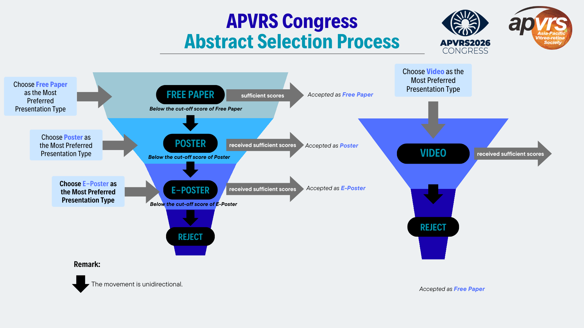 Please note that the abstract selection process is unidirectional. This means that a poster abstract receiving sufficient scores can CANNOT be upgraded to a Free Paper.