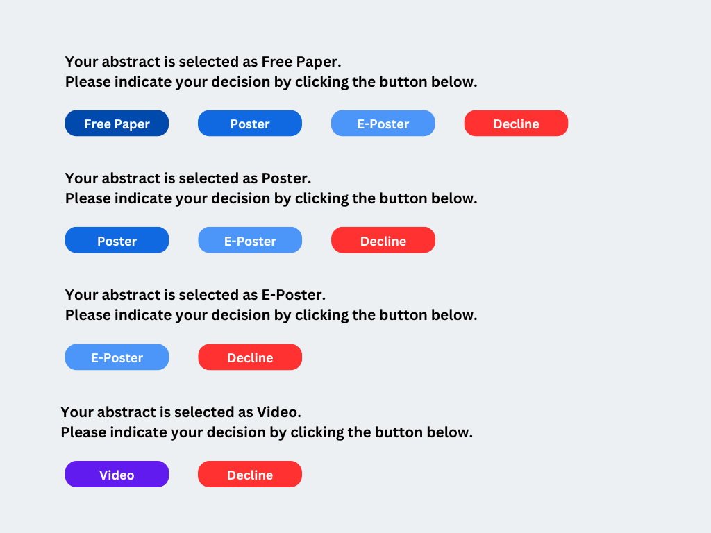 Abstract submitters will receive an email notification from the congress system if their abstracts are selected. According to the corresponding accepted presentation type, the abstract submitter can make final decision on the presentation type as illustrated in figure 2 below.